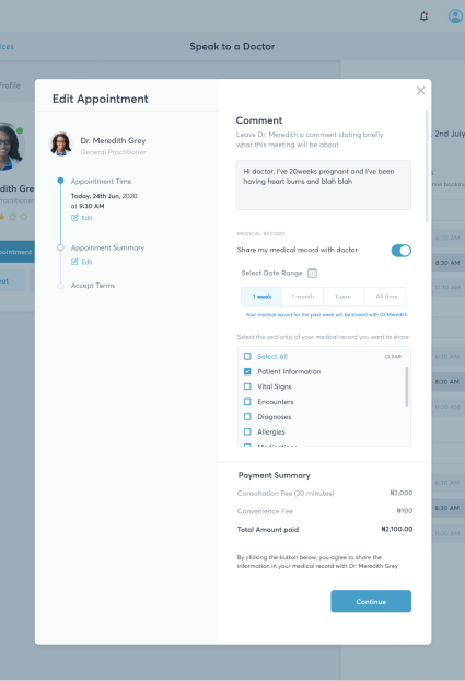 Under past appointments; you can view more information about a completed appointment. Furthermore, you can edit your review of the Doctors, view Doctors note and Book session again.
