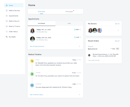 Overview: this shows information about your upcoming & past appointments. Also shows you a timeline of your medical activities, favourite Doctors & recent orders.
